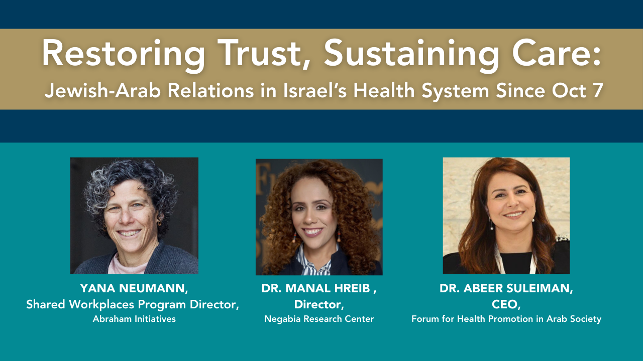 Speakers: Yana Neumann, Shared Workplaces Program Director, the Abraham Initiatives Dr. Manal Hreib, Director, the Negabia Research Center Dr. Abeer Suleiman, CEO, Forum for Health Promotion in Arab Society